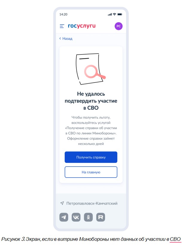 Если данные о заявителе не будут найдены в витрине Минобороны, сервис предложит пользователю обратиться за получением справки об участии в СВО на форму услуги ВСЦ Минобороны (см. Рисунок 3).